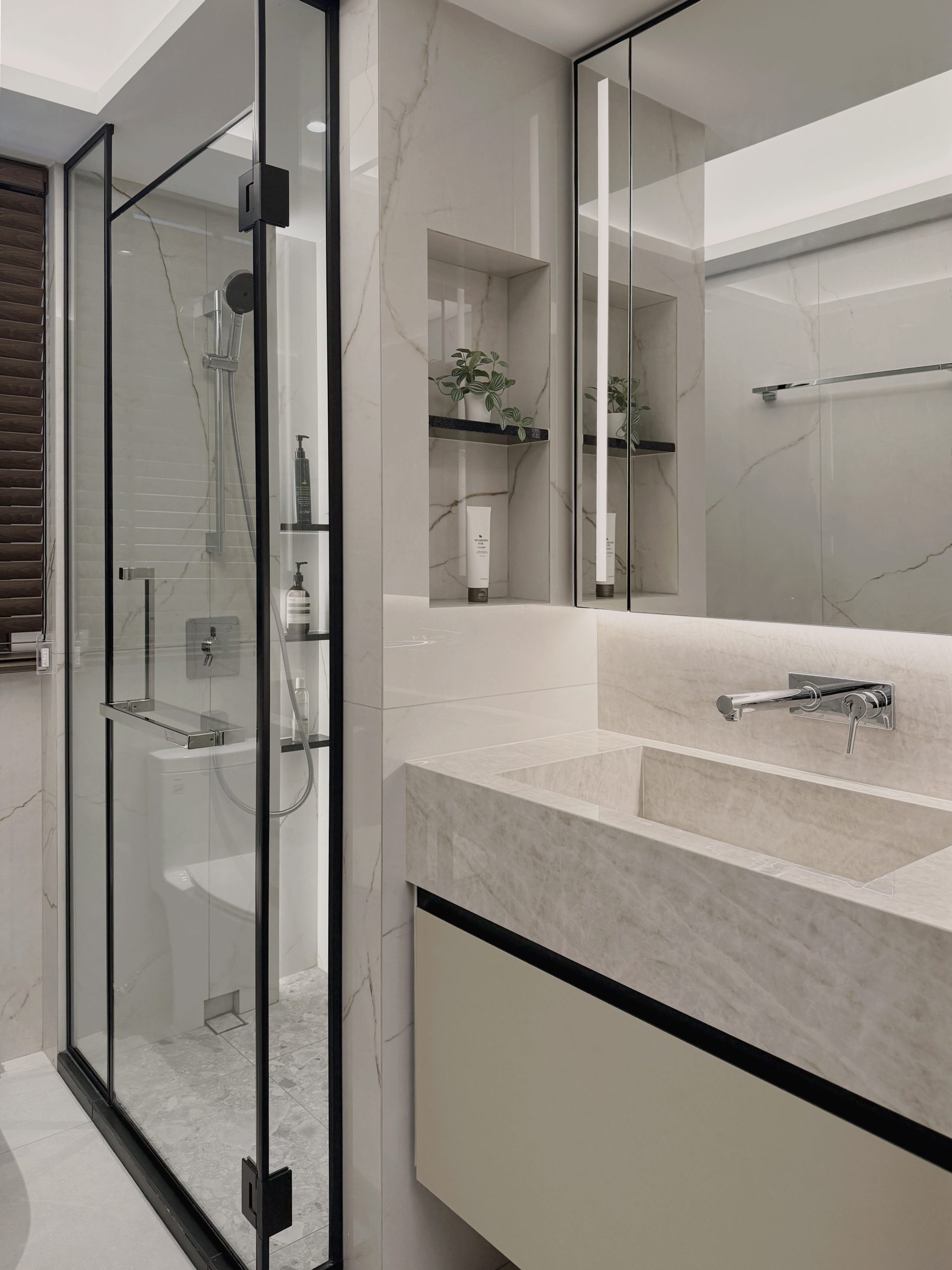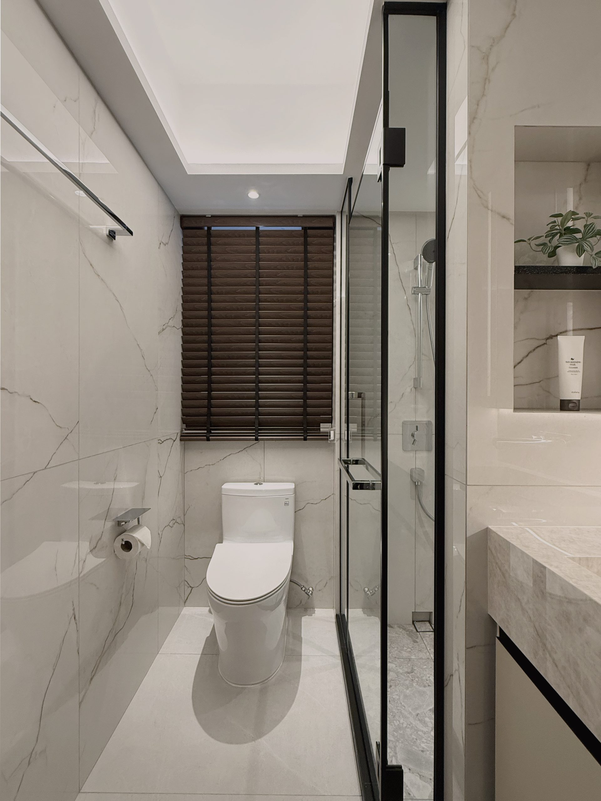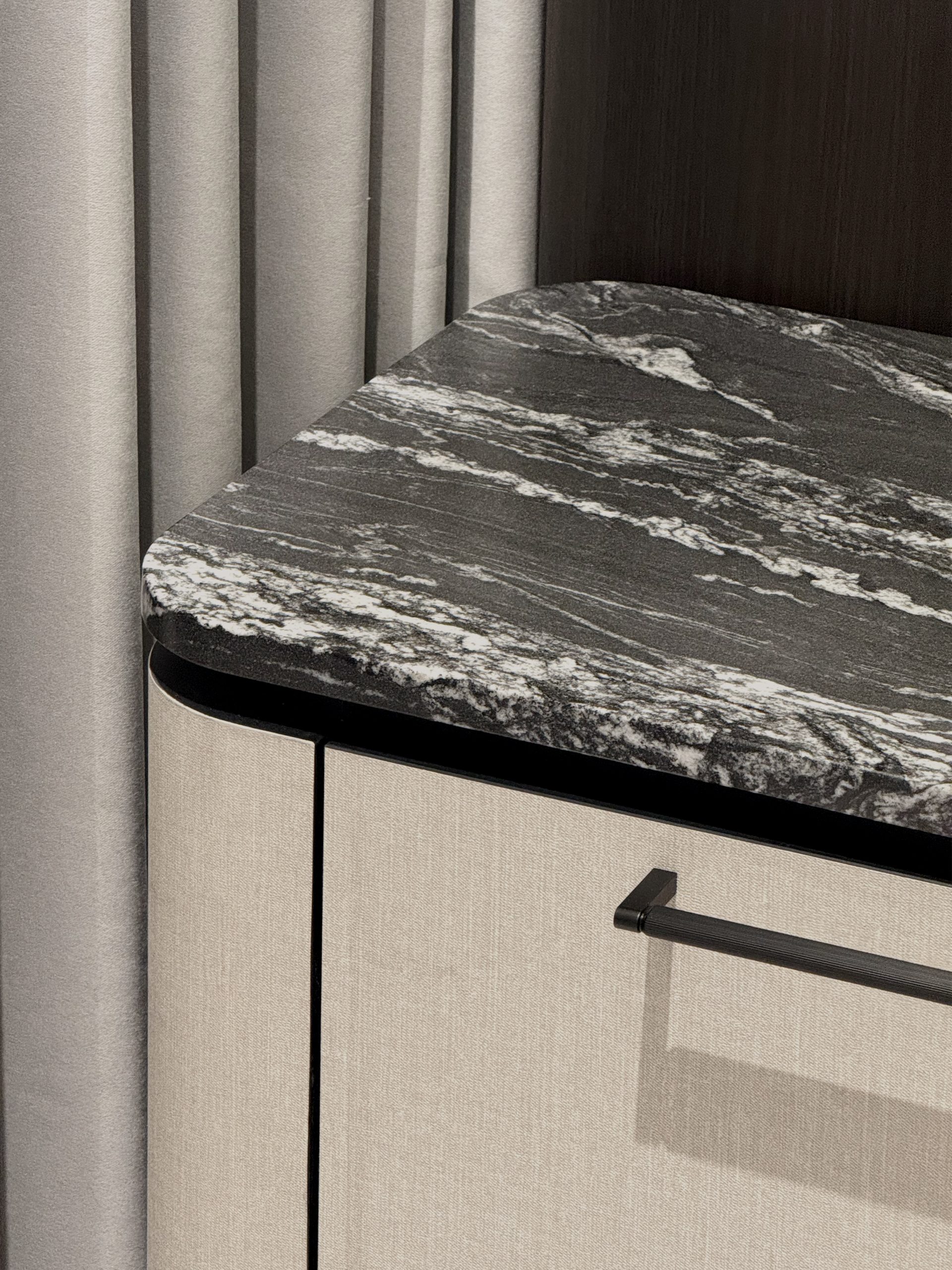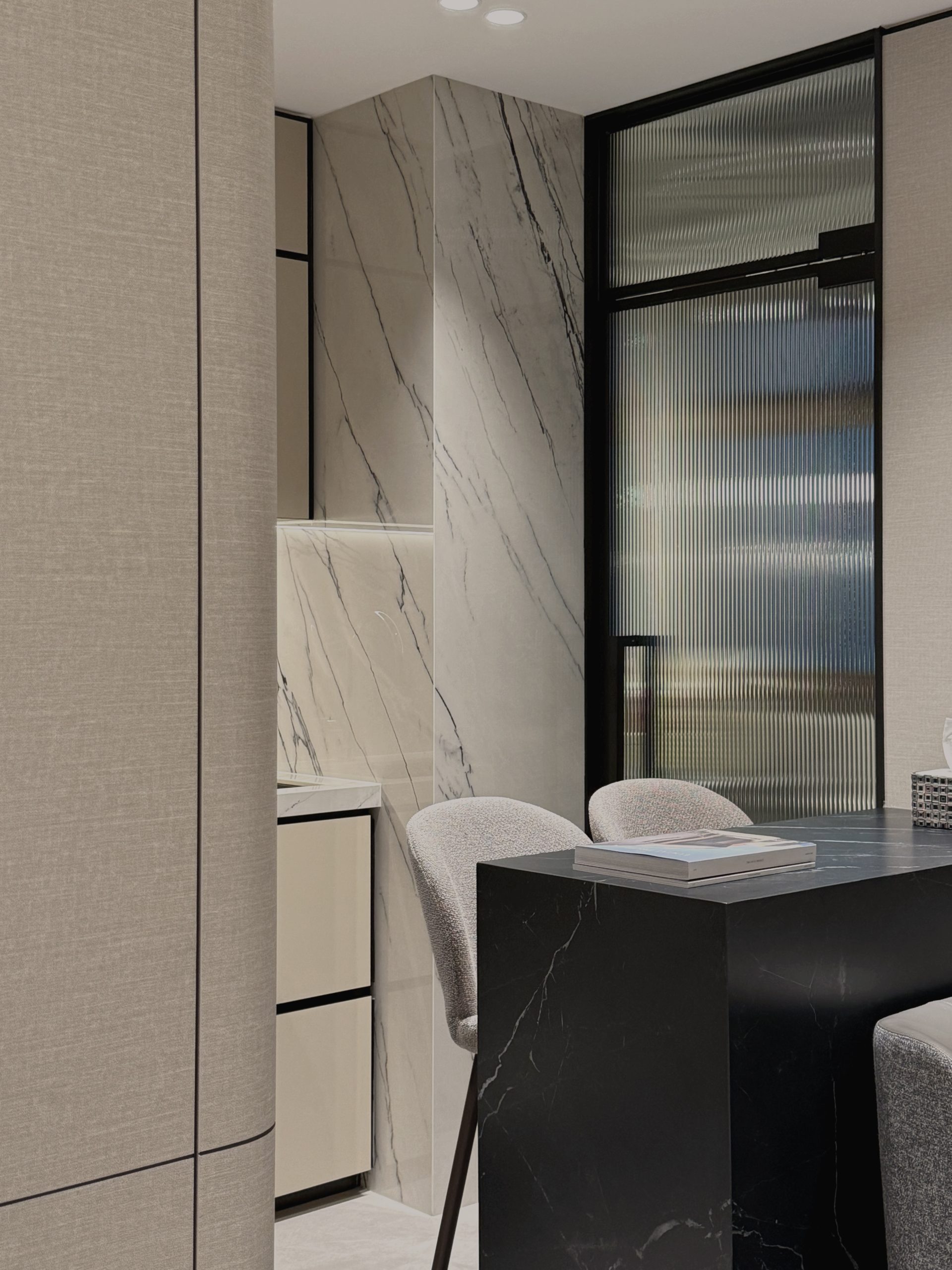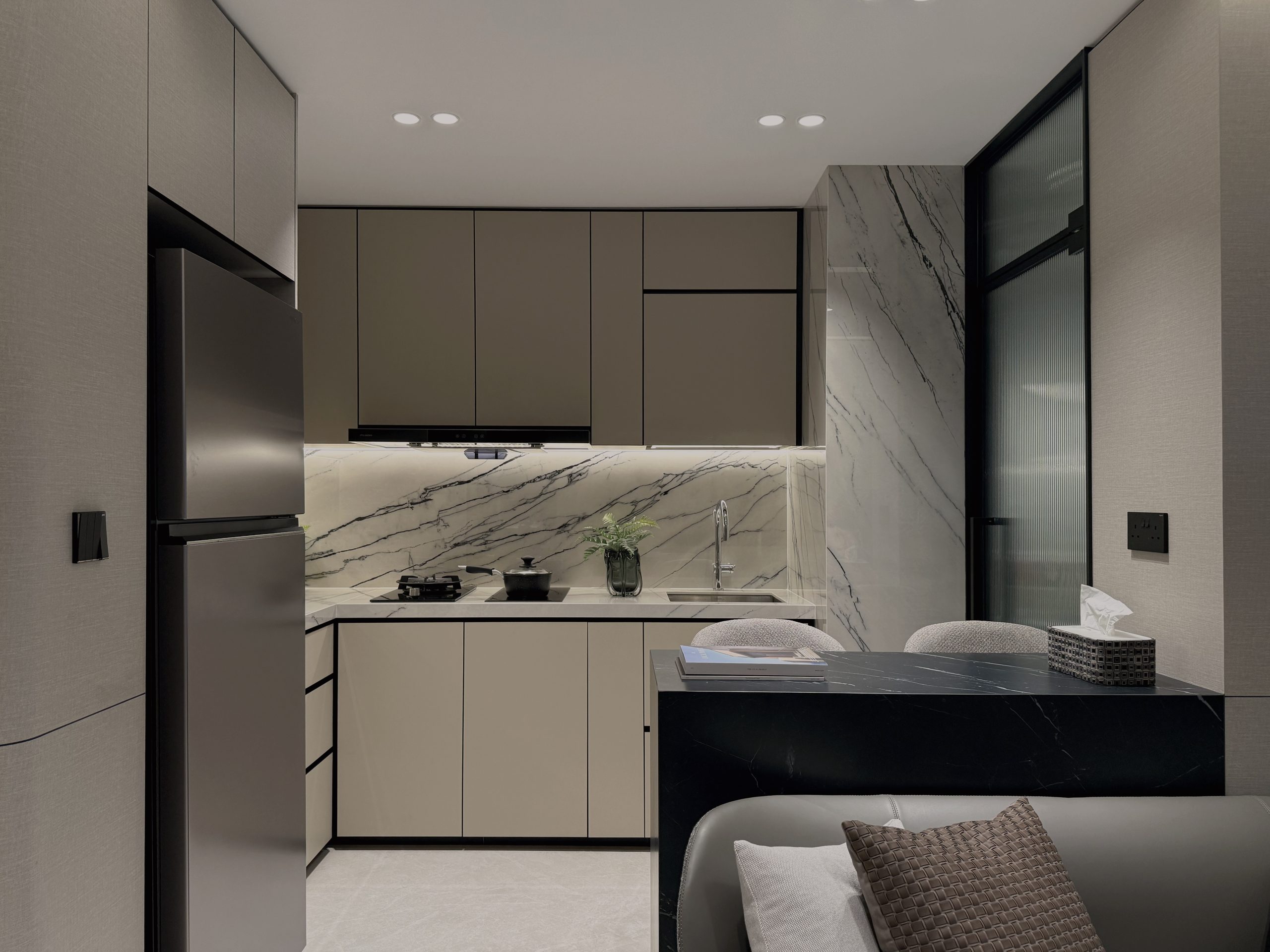 Designed to evoke the experience of a luxury hotel suite, this cosy 2-room Flexi BTO apartment is reimagined into an intimate retreat defined by opulent materials and meticulous detailing. Large-format Italian tiles, graphite surfaces, and premium stone countertops set the tone for an indulgent interior, forming a palette that exudes understated opulence.