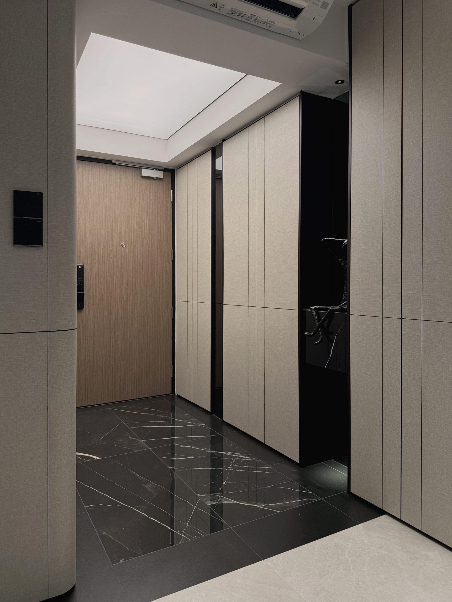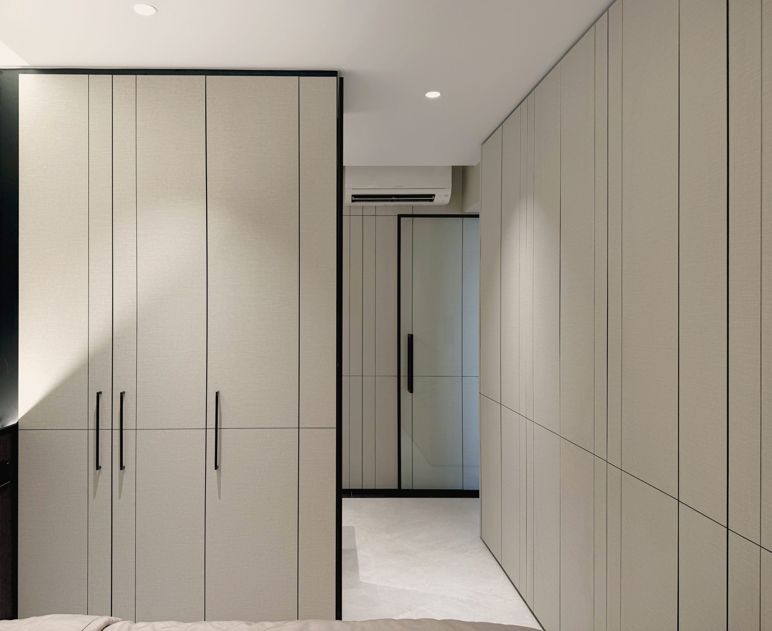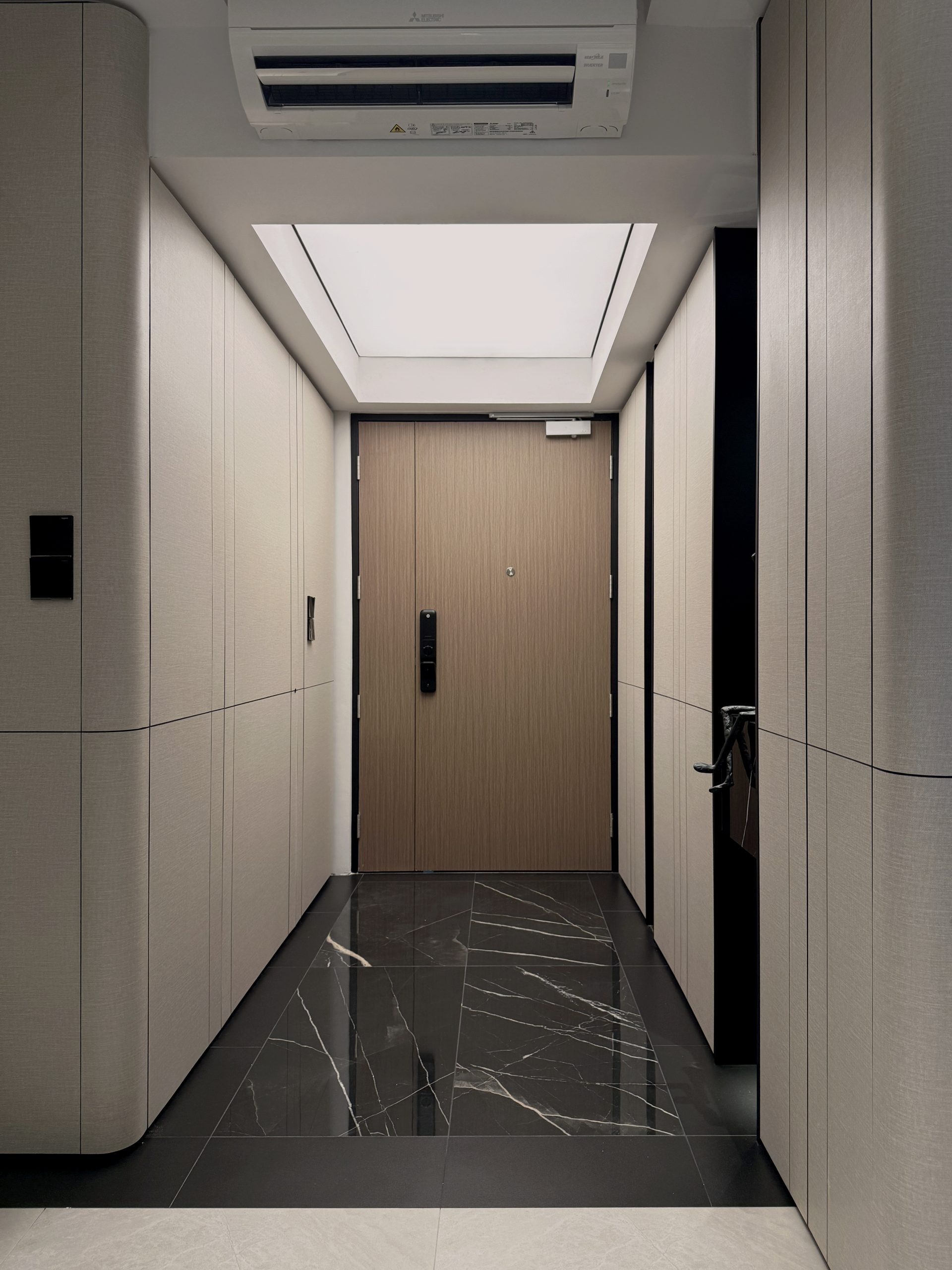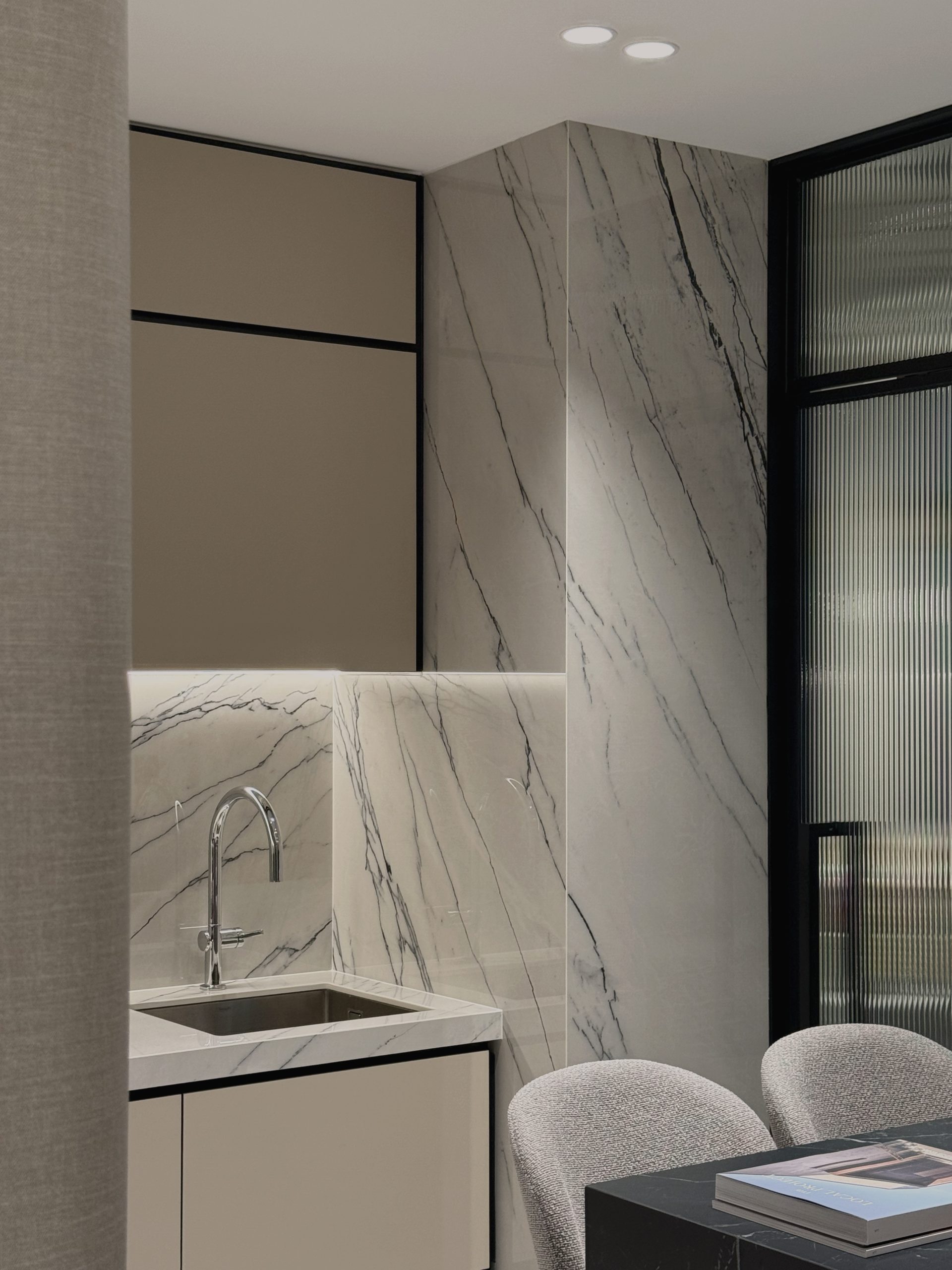 Walls are seamlessly clad in laminates that merge into custom cabinetry, blurring the boundary between wall and furniture while preserving clean, uninterrupted lines throughout the home. Through deliberate material selection and precise spatial planning, the compact residence is transformed into a sumptuous, hotel-like sanctuary, proving that even a modest footprint can embody quiet grandeur and refined luxury.