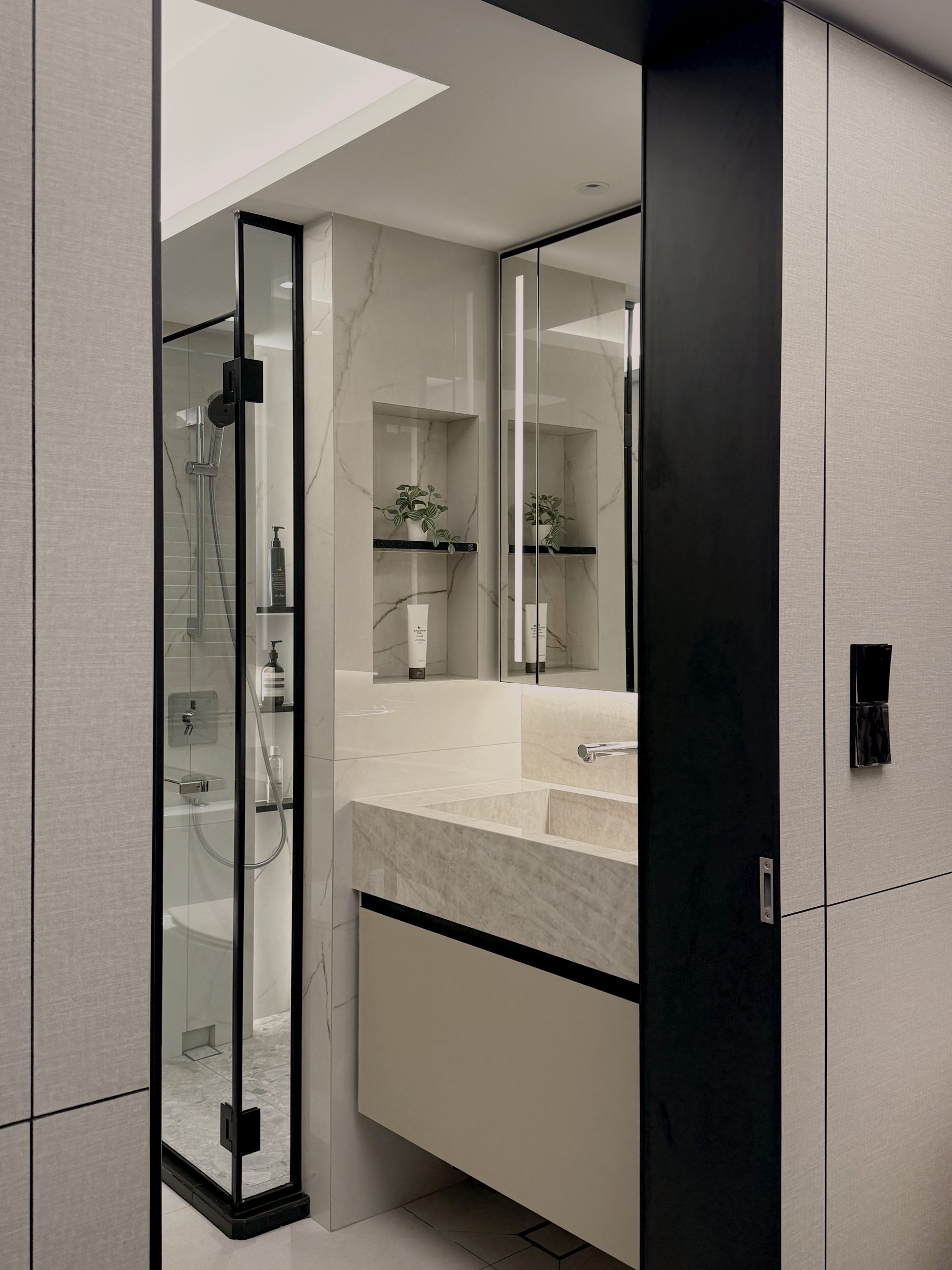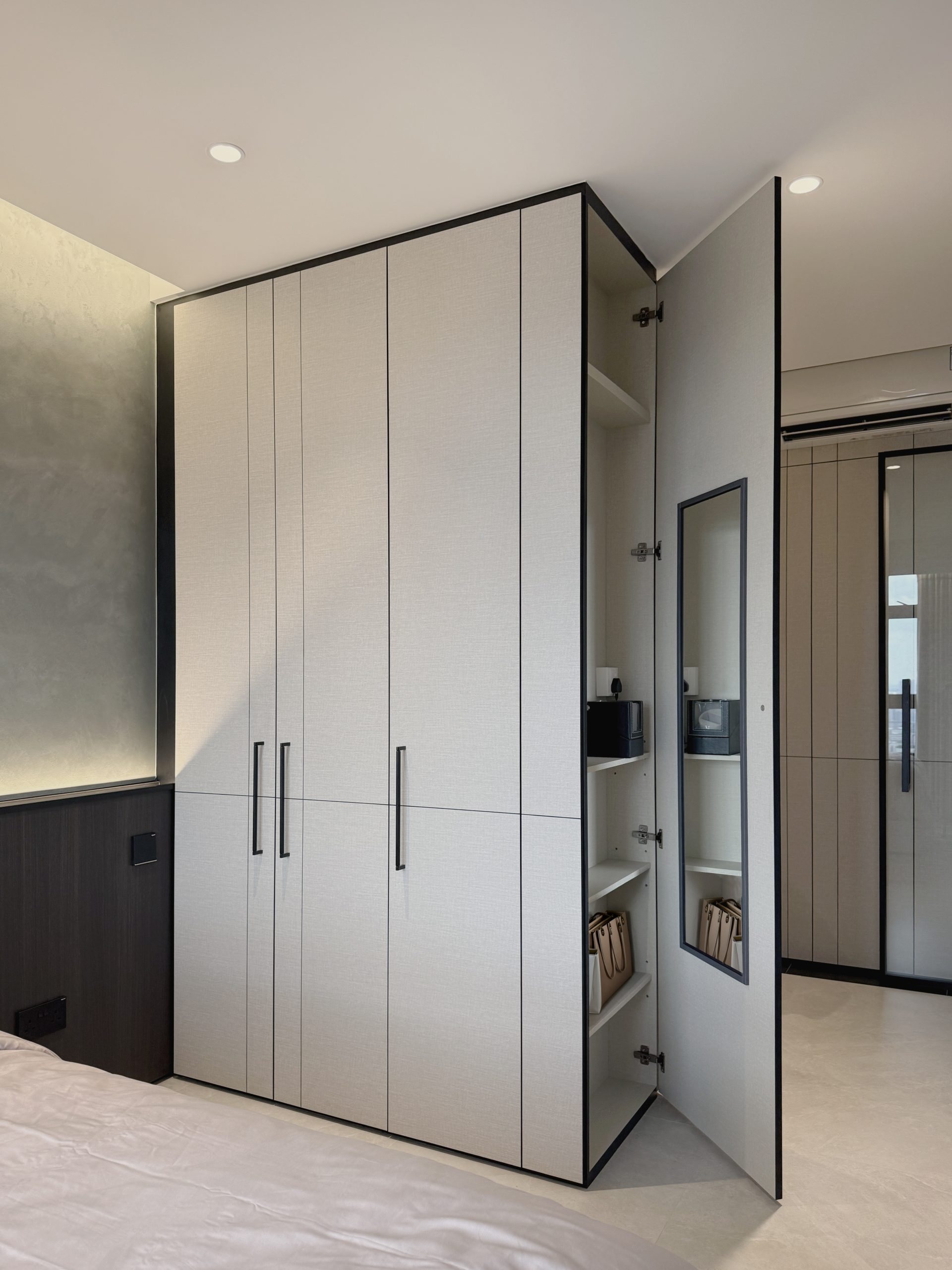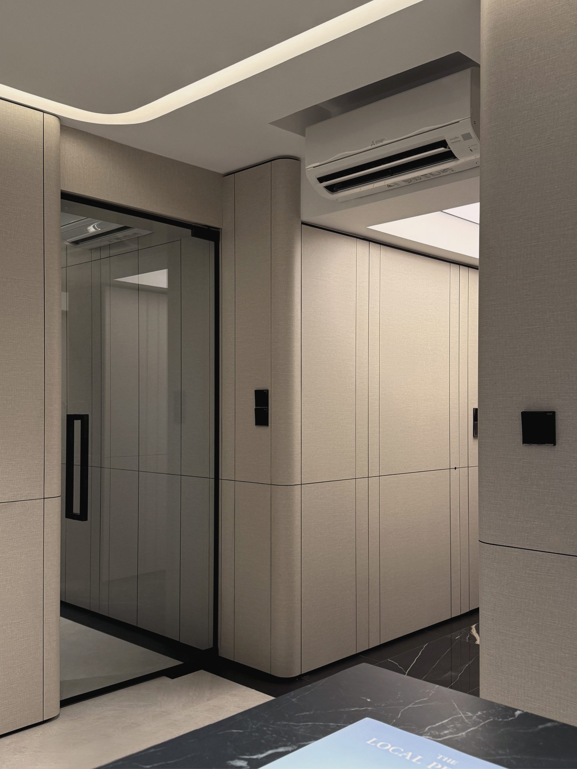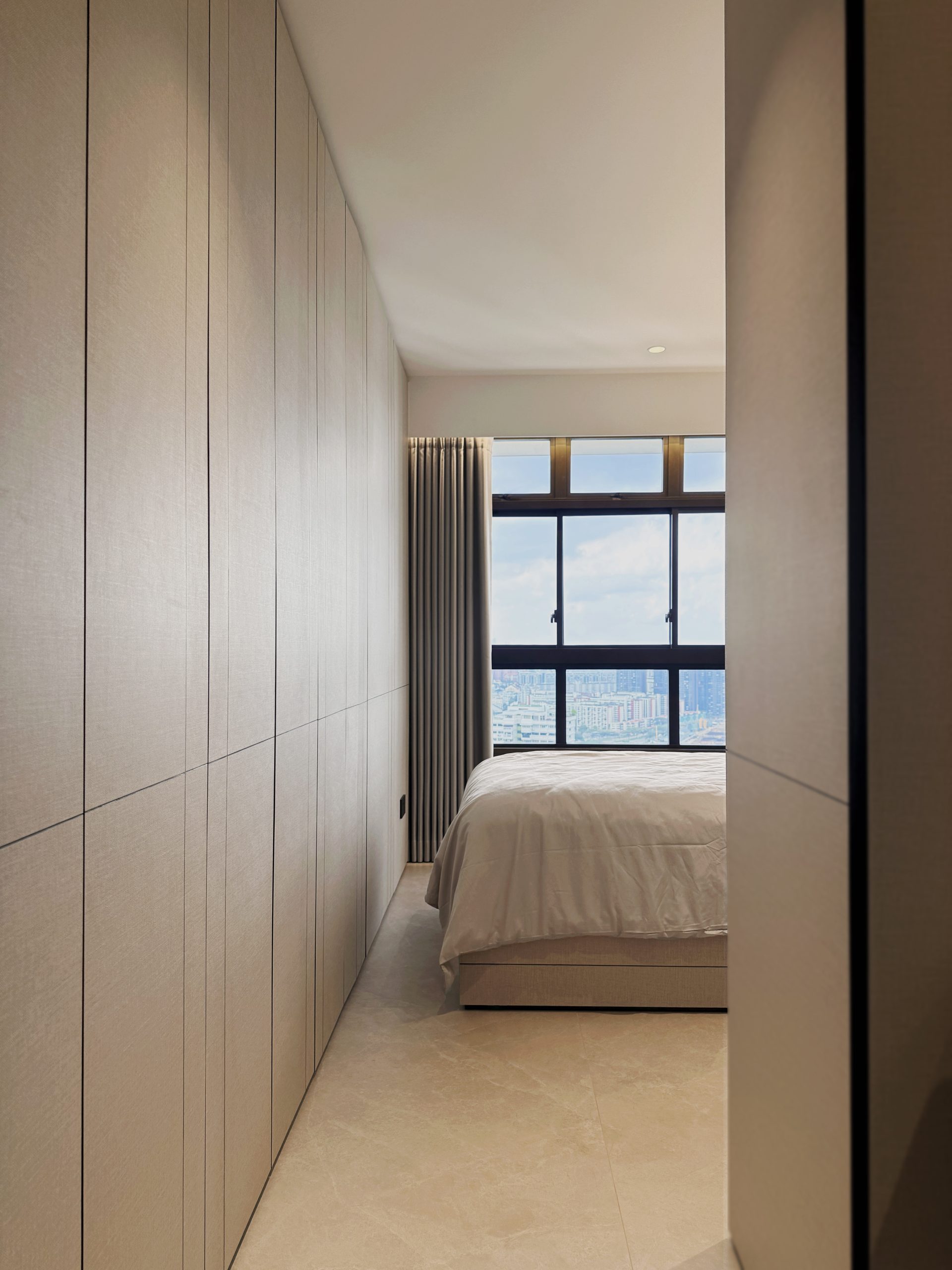 Walls are seamlessly clad in laminates that merge into custom cabinetry, blurring the boundary between wall and furniture while preserving clean, uninterrupted lines throughout the home. Through deliberate material selection and precise spatial planning, the compact residence is transformed into a sumptuous, hotel-like sanctuary, proving that even a modest footprint can embody quiet grandeur and refined luxury.