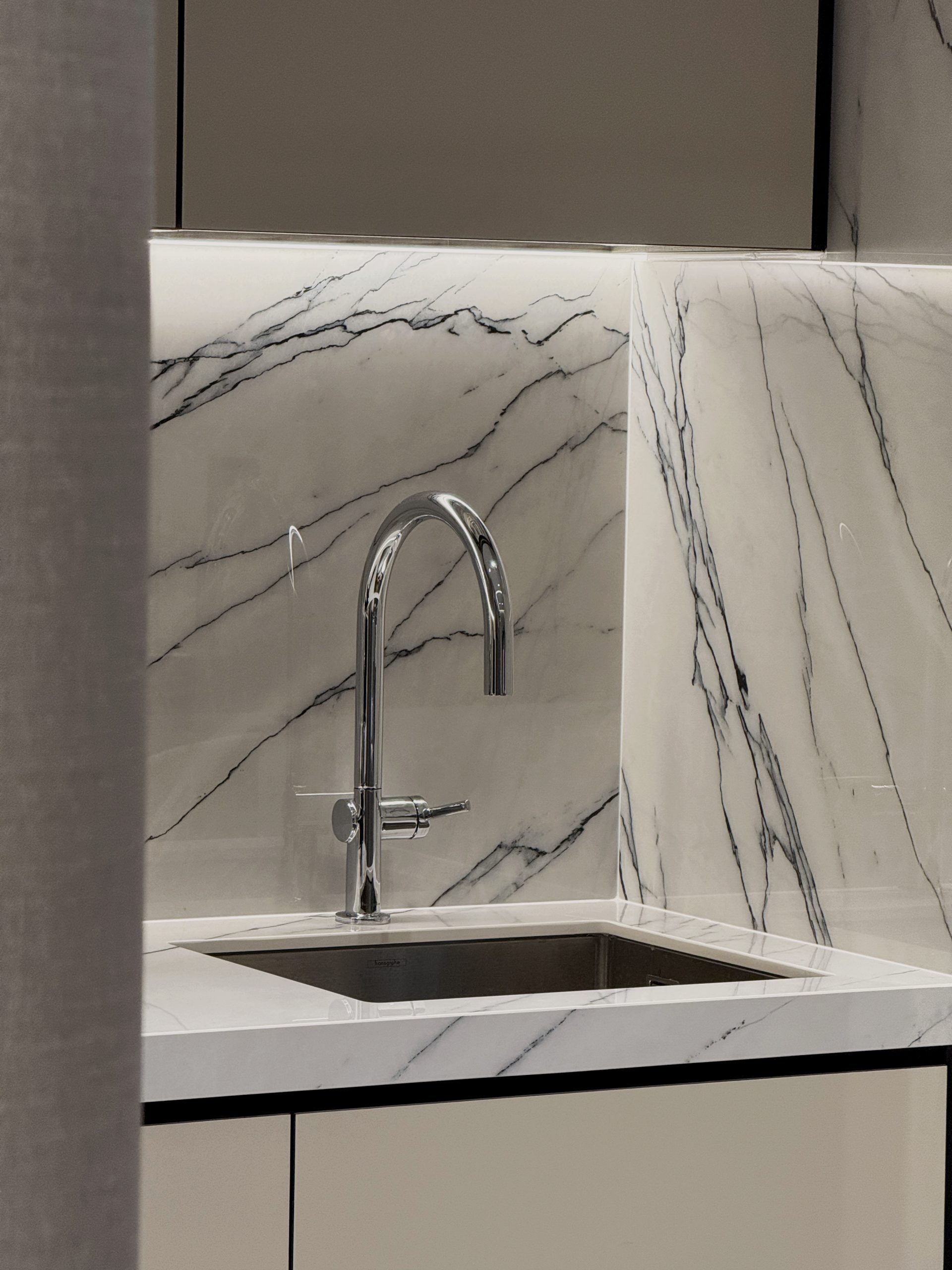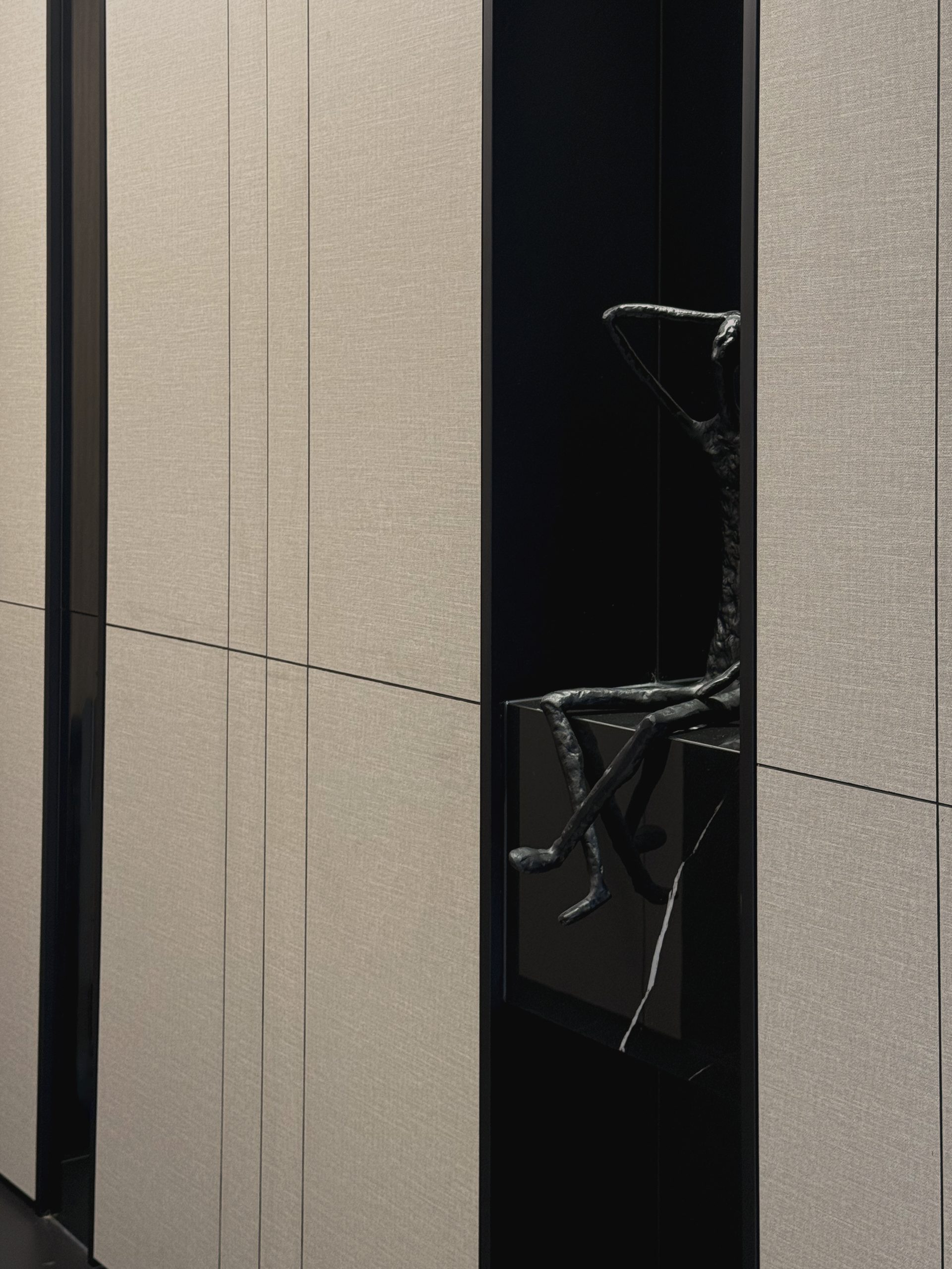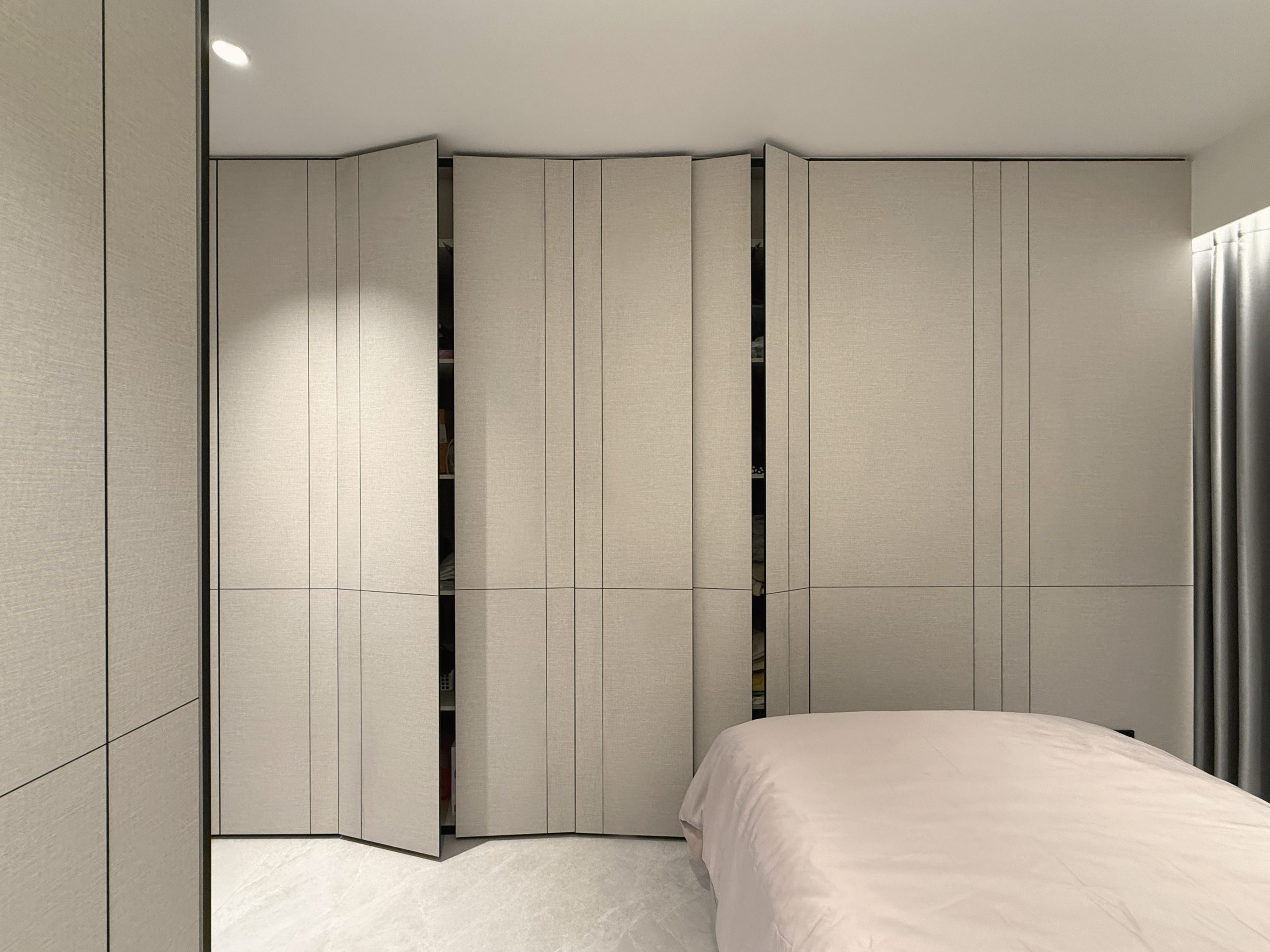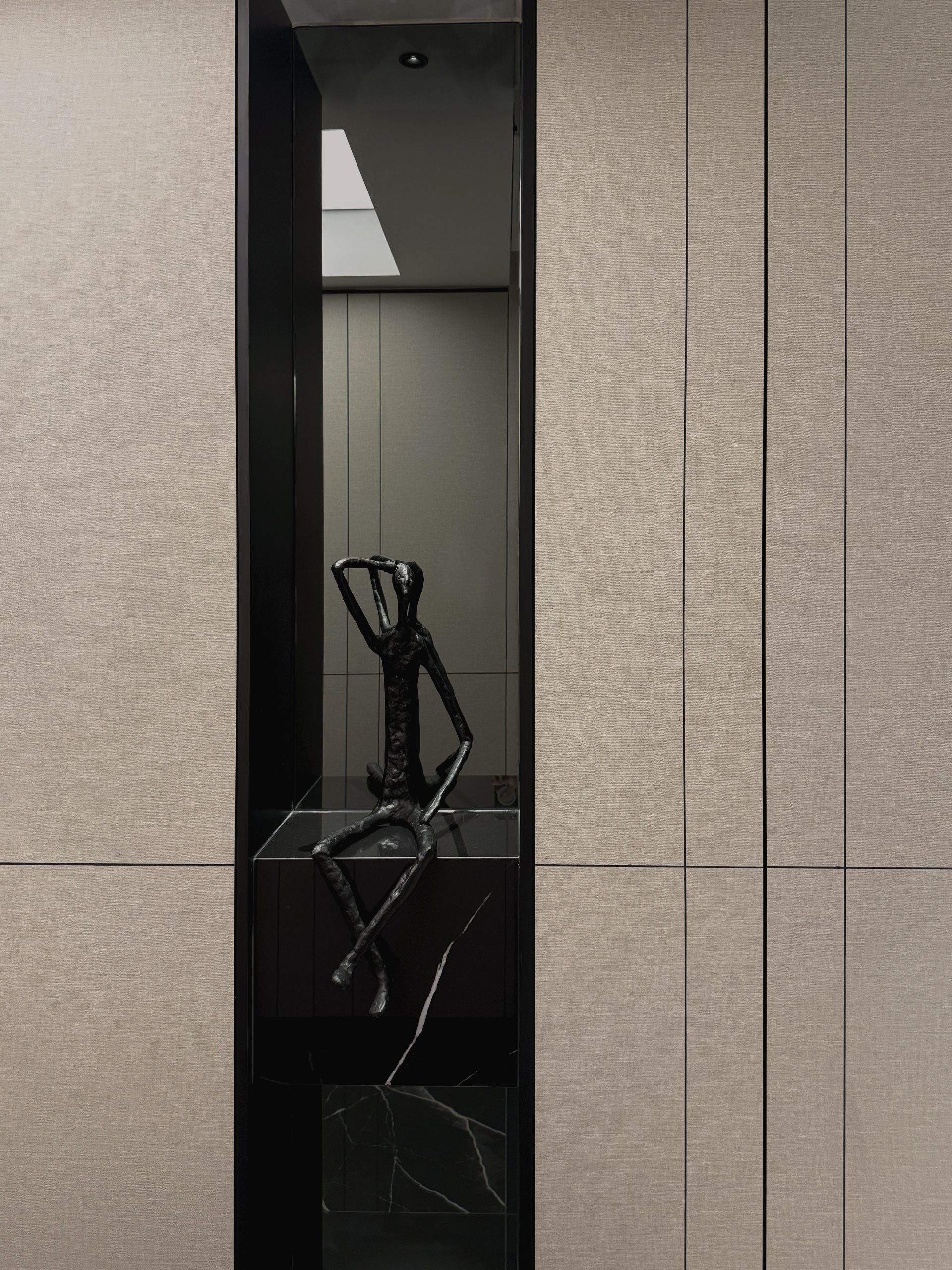 Walls are seamlessly clad in laminates that merge into custom cabinetry, blurring the boundary between wall and furniture while preserving clean, uninterrupted lines throughout the home. Through deliberate material selection and precise spatial planning, the compact residence is transformed into a sumptuous, hotel-like sanctuary, proving that even a modest footprint can embody quiet grandeur and refined luxury.